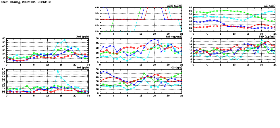 | Air Quality Data Time Series in Kwai Chung (2025/11/08) | ( Line colors: Day -3 Day -2 Day -1 Current day ) | 2D Map Current AQHI |
