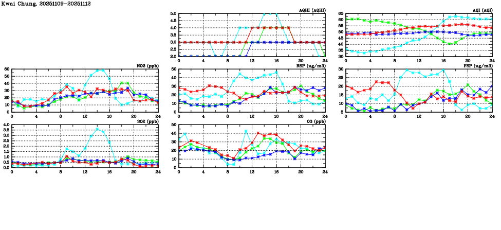 | Air Quality Data Time Series in Kwai Chung (2025/11/12) | ( Line colors: Day -3 Day -2 Day -1 Current day ) | 2D Map Current AQHI |