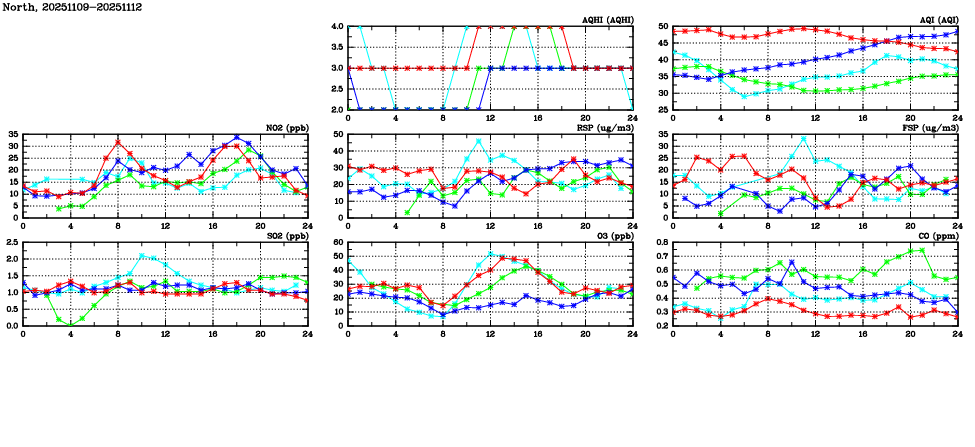 | Air Quality Data Time Series in North (2025/11/12) | ( Line colors: Day -3 Day -2 Day -1 Current day ) | 2D Map Current AQHI |