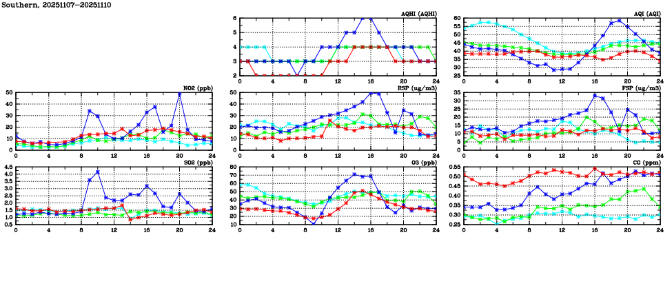 | Air Quality Data Time Series in Southern (2025/11/10) | ( Line colors: Day -3 Day -2 Day -1 Current day ) | 2D Map Current AQHI |