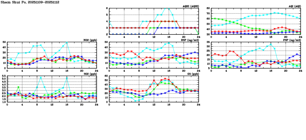 | Air Quality Data Time Series in Sham Shui Po (2025/11/12) | ( Line colors: Day -3 Day -2 Day -1 Current day ) | 2D Map Current AQHI |