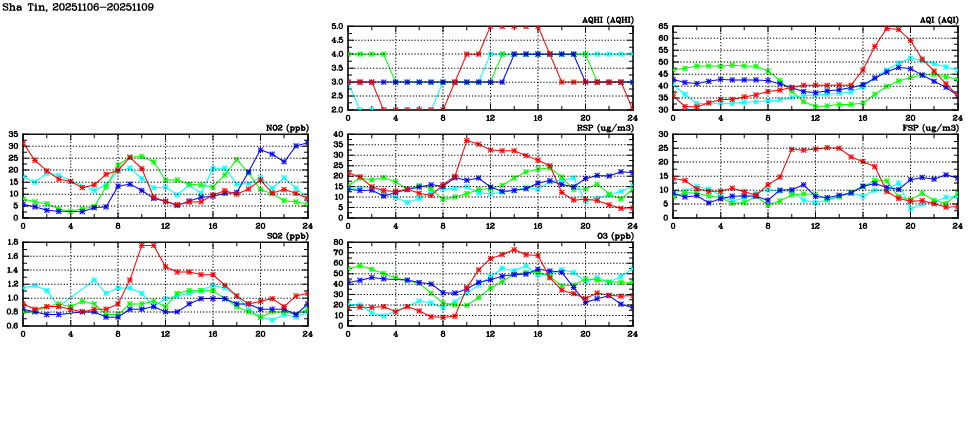 | Air Quality Data Time Series in Sha Tin (2025/11/09) | ( Line colors: Day -3 Day -2 Day -1 Current day ) | 2D Map Current AQHI |
