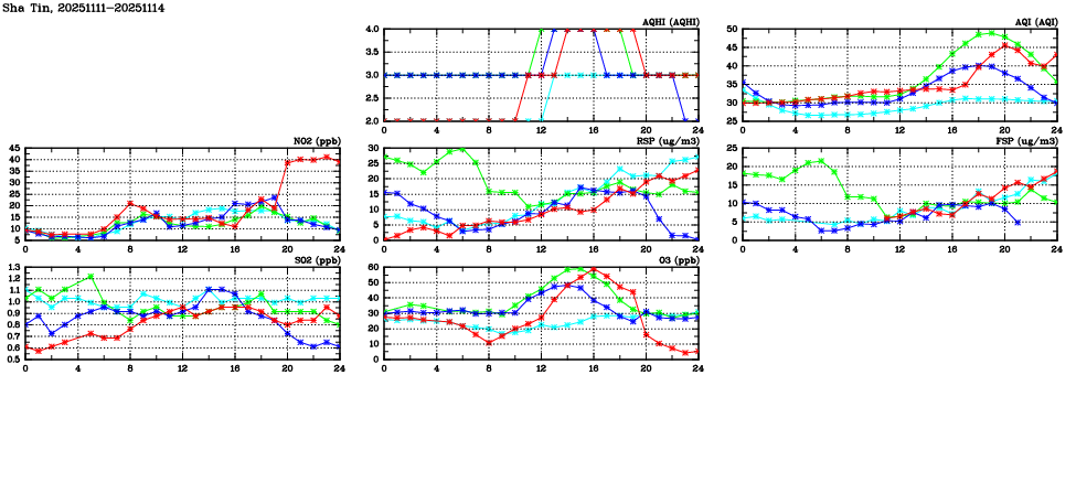 | Air Quality Data Time Series in Sha Tin (2025/11/14) | ( Line colors: Day -3 Day -2 Day -1 Current day ) | 2D Map Current AQHI |