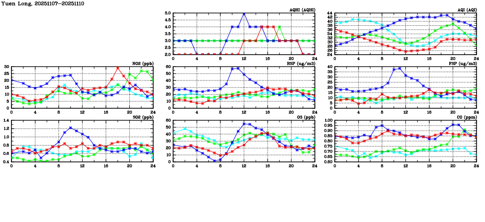 | Air Quality Data Time Series in Yuen Long (2025/11/10) | ( Line colors: Day -3 Day -2 Day -1 Current day ) | 2D Map Current AQHI |