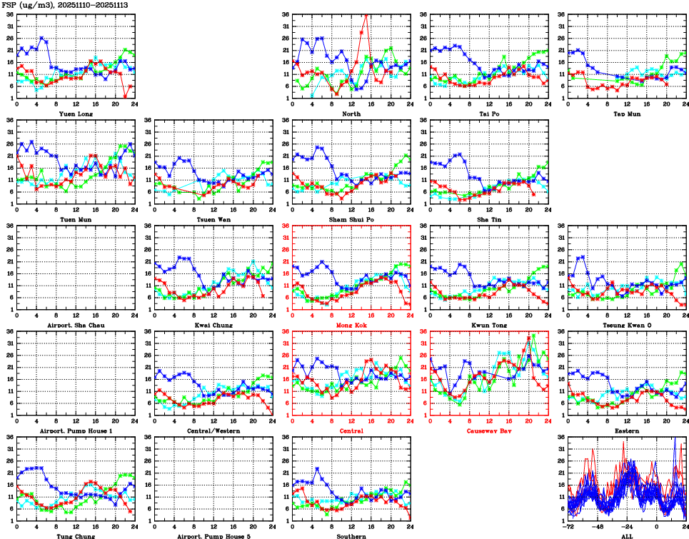 | Air Quality Data Time Series for FSP (2025/11/13) | ( Line colors: Day -3 Day -2 Day -1 Current day ) | 2D Map Current AQHI |
