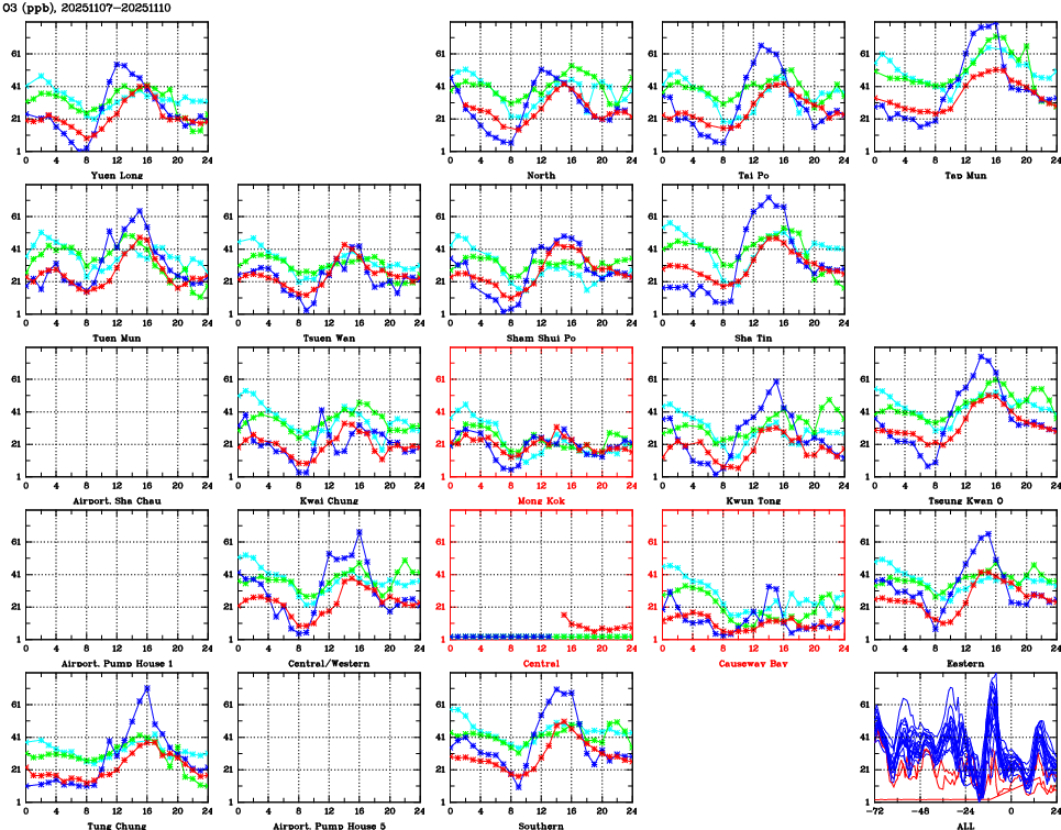 | Air Quality Data Time Series for O3 (2025/11/10) | ( Line colors: Day -3 Day -2 Day -1 Current day ) | 2D Map Current AQHI |