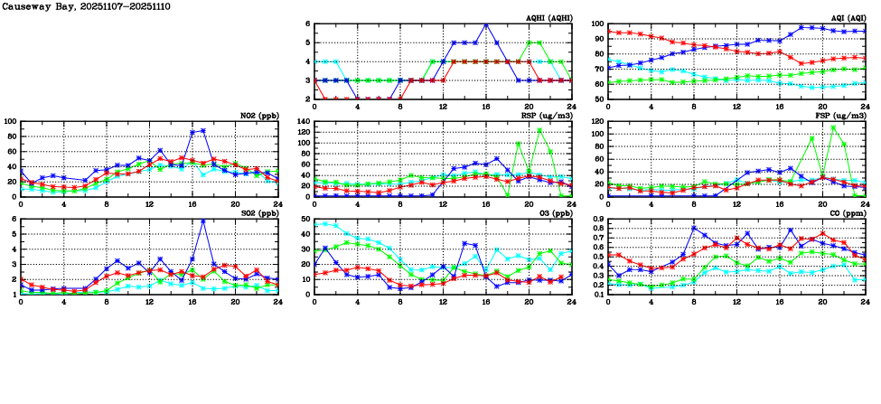 | Air Quality Data Time Series in Causeway Bay (2025/11/10) | ( Line colors: Day -3 Day -2 Day -1 Current day ) | 2D Map Current AQHI |
