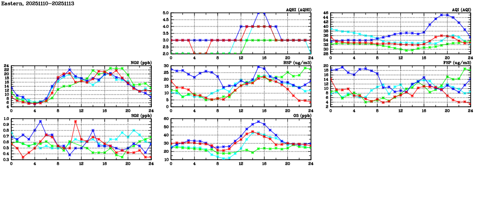 | Air Quality Data Time Series in Eastern (2025/11/13) | ( Line colors: Day -3 Day -2 Day -1 Current day ) | 2D Map Current AQHI |