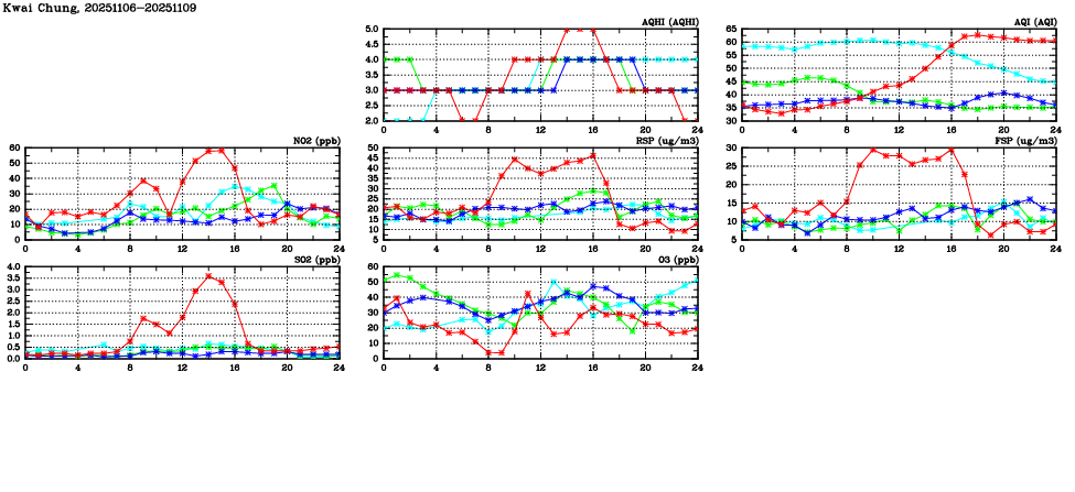| Air Quality Data Time Series in Kwai Chung (2025/11/09) | ( Line colors: Day -3 Day -2 Day -1 Current day ) | 2D Map Current AQHI |