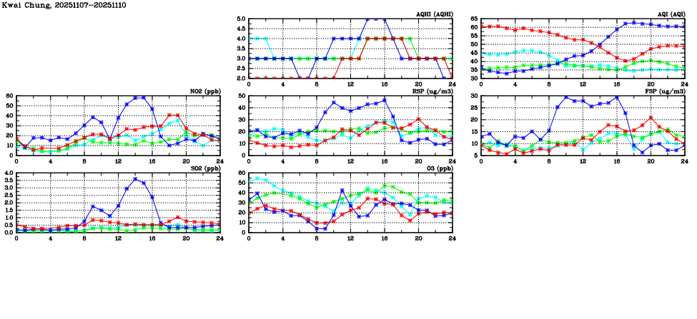 | Air Quality Data Time Series in Kwai Chung (2025/11/10) | ( Line colors: Day -3 Day -2 Day -1 Current day ) | 2D Map Current AQHI |