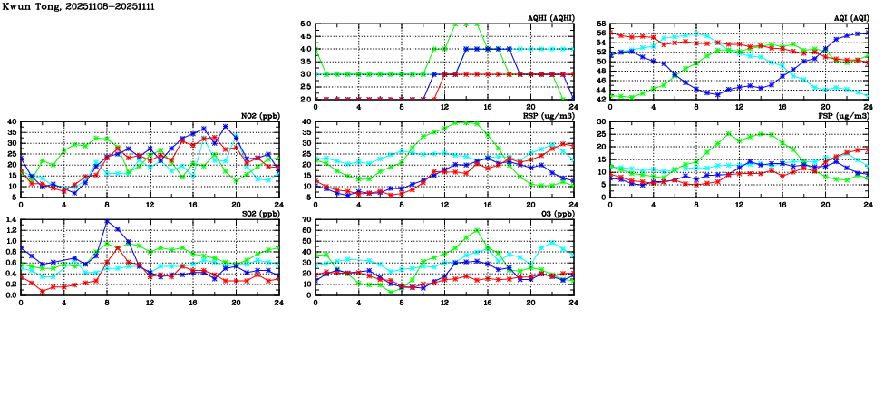 | Air Quality Data Time Series in Kwun Tong (2025/11/11) | ( Line colors: Day -3 Day -2 Day -1 Current day ) | 2D Map Current AQHI |