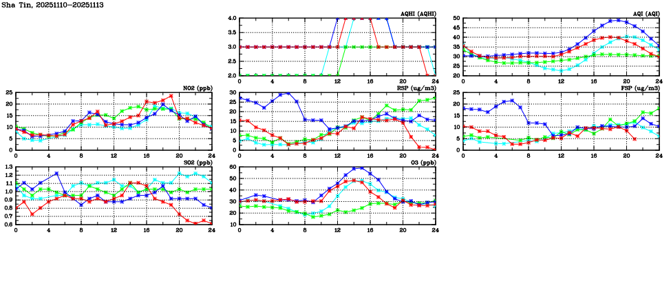 | Air Quality Data Time Series in Sha Tin (2025/11/13) | ( Line colors: Day -3 Day -2 Day -1 Current day ) | 2D Map Current AQHI |