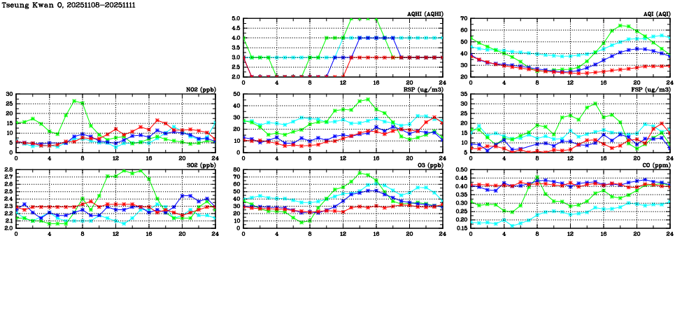 | Air Quality Data Time Series in Tseung Kwan O (2025/11/11) | ( Line colors: Day -3 Day -2 Day -1 Current day ) | 2D Map Current AQHI |