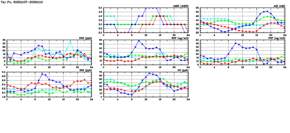 | Air Quality Data Time Series in Tai Po (2025/11/10) | ( Line colors: Day -3 Day -2 Day -1 Current day ) | 2D Map Current AQHI |