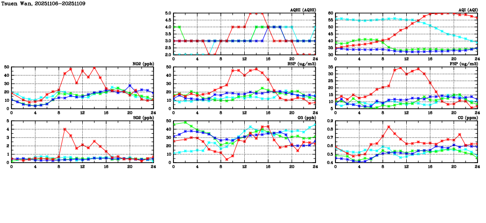 | Air Quality Data Time Series in Tsuen Wan (2025/11/09) | ( Line colors: Day -3 Day -2 Day -1 Current day ) | 2D Map Current AQHI |