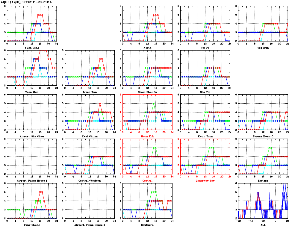 | Air Quality Data Time Series for AQHI (2025/11/14) | ( Line colors: Day -3 Day -2 Day -1 Current day ) | 2D Map Current AQHI |