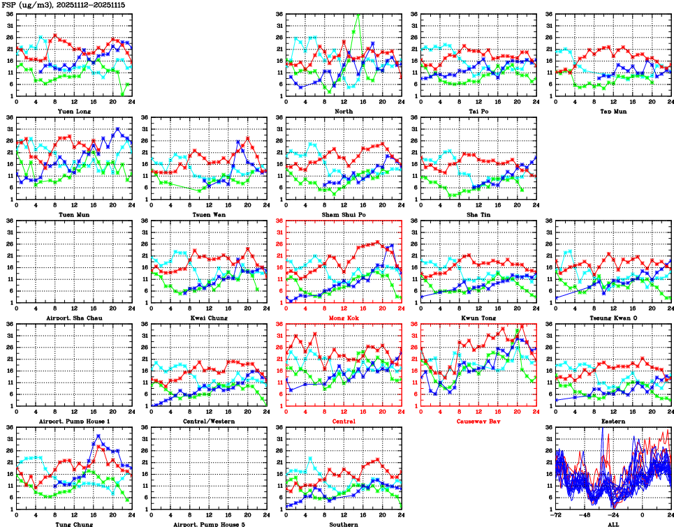 | Air Quality Data Time Series for FSP (2025/11/15) | ( Line colors: Day -3 Day -2 Day -1 Current day ) | 2D Map Current AQHI |