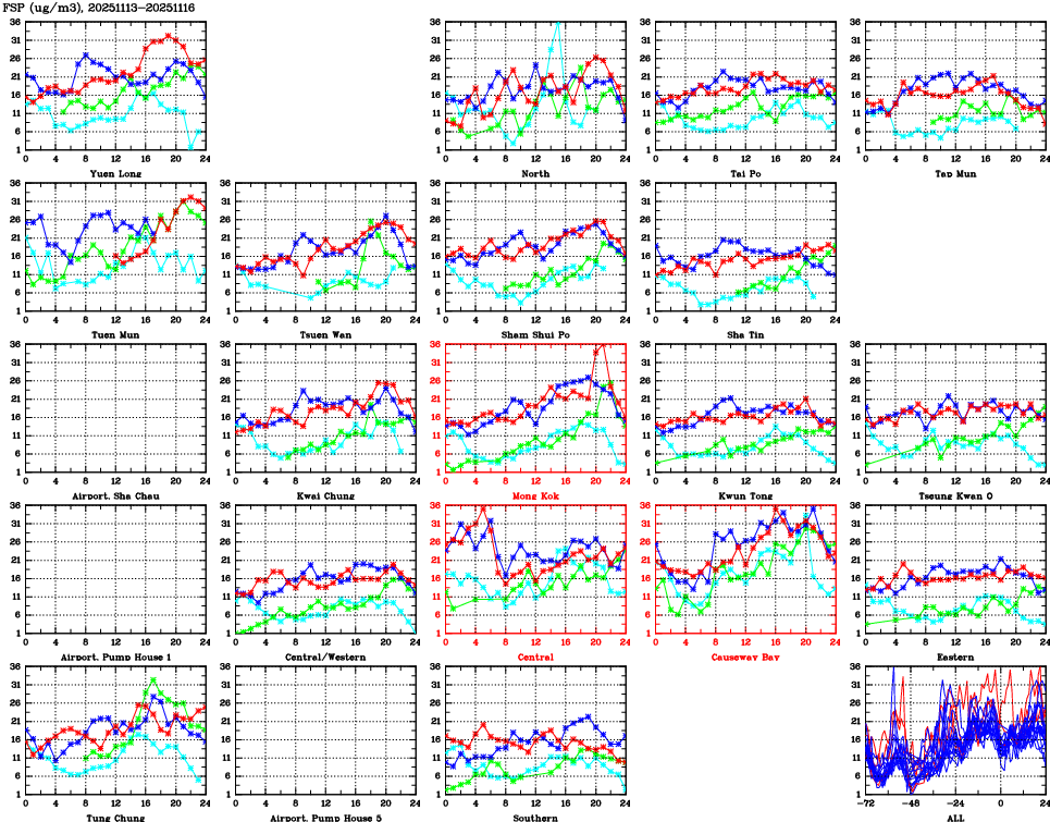 | Air Quality Data Time Series for FSP (2025/11/16) | ( Line colors: Day -3 Day -2 Day -1 Current day ) | 2D Map Current AQHI |