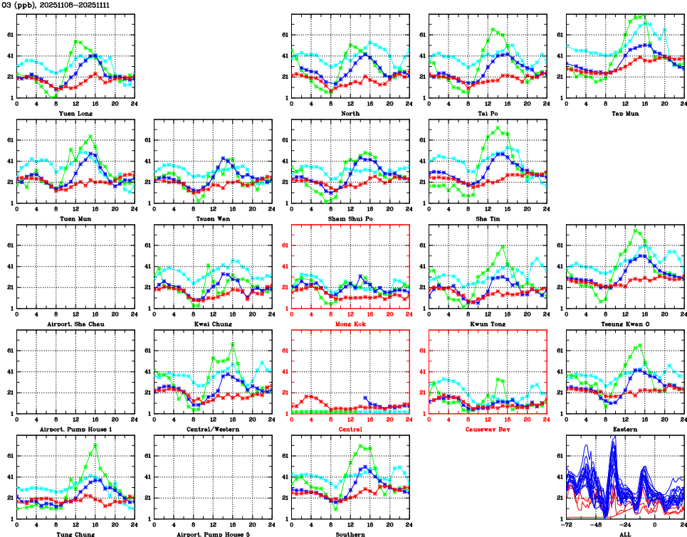 | Air Quality Data Time Series for O3 (2025/11/11) | ( Line colors: Day -3 Day -2 Day -1 Current day ) | 2D Map Current AQHI |