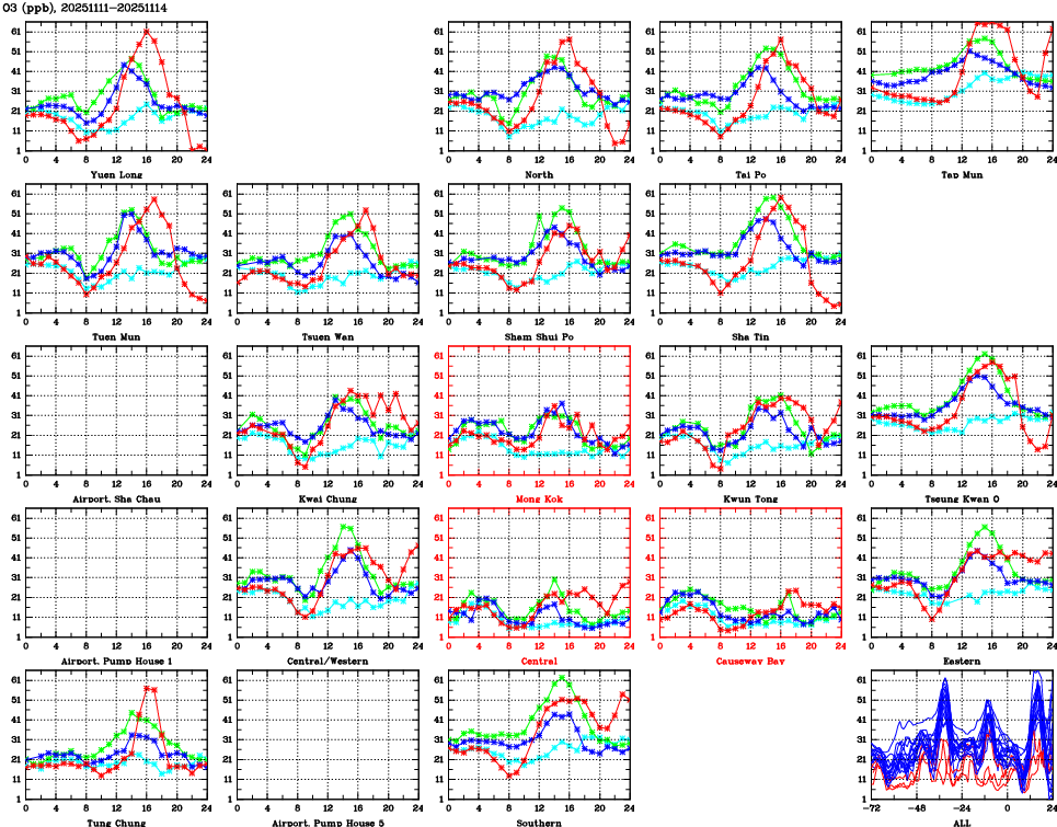 | Air Quality Data Time Series for O3 (2025/11/14) | ( Line colors: Day -3 Day -2 Day -1 Current day ) | 2D Map Current AQHI |
