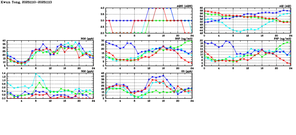 | Air Quality Data Time Series in Kwun Tong (2025/11/13) | ( Line colors: Day -3 Day -2 Day -1 Current day ) | 2D Map Current AQHI |