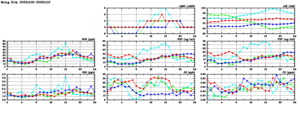| Air Quality Data Time Series in Mong Kok (2025/11/12) | ( Line colors: Day -3 Day -2 Day -1 Current day ) | 2D Map Current AQHI |