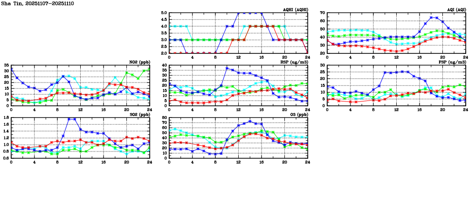 | Air Quality Data Time Series in Sha Tin (2025/11/10) | ( Line colors: Day -3 Day -2 Day -1 Current day ) | 2D Map Current AQHI |