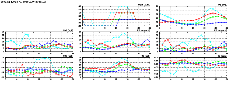 | Air Quality Data Time Series in Tseung Kwan O (2025/11/12) | ( Line colors: Day -3 Day -2 Day -1 Current day ) | 2D Map Current AQHI |