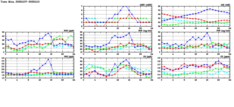 | Air Quality Data Time Series in Tuen Mun (2025/11/10) | ( Line colors: Day -3 Day -2 Day -1 Current day ) | 2D Map Current AQHI |