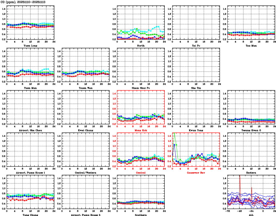 | Air Quality Data Time Series for CO (2025/11/13) | ( Line colors: Day -3 Day -2 Day -1 Current day ) | 2D Map Current AQHI |