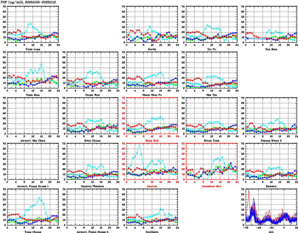 | Air Quality Data Time Series for FSP (2025/11/12) | ( Line colors: Day -3 Day -2 Day -1 Current day ) | 2D Map Current AQHI |