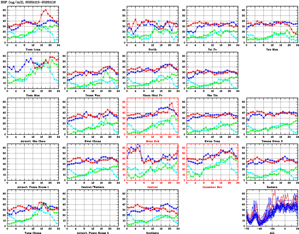 | Air Quality Data Time Series for RSP (2025/11/16) | ( Line colors: Day -3 Day -2 Day -1 Current day ) | 2D Map Current AQHI |