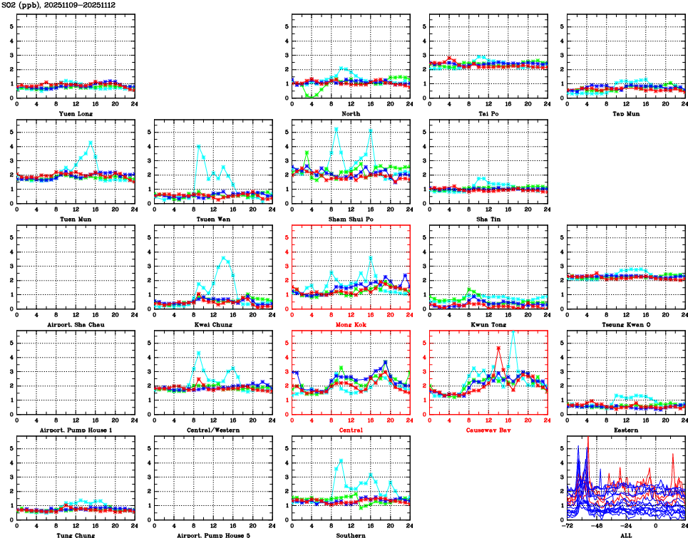 | Air Quality Data Time Series for SO2 (2025/11/12) | ( Line colors: Day -3 Day -2 Day -1 Current day ) | 2D Map Current AQHI |