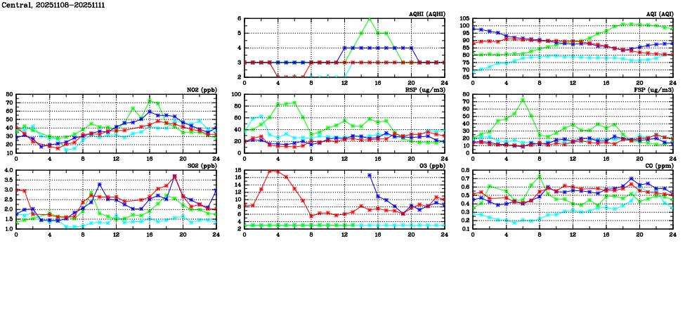 | Air Quality Data Time Series in Central (2025/11/11) | ( Line colors: Day -3 Day -2 Day -1 Current day ) | 2D Map Current AQHI |