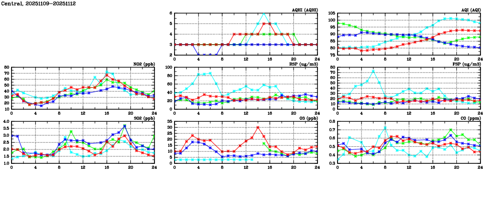 | Air Quality Data Time Series in Central (2025/11/12) | ( Line colors: Day -3 Day -2 Day -1 Current day ) | 2D Map Current AQHI |
