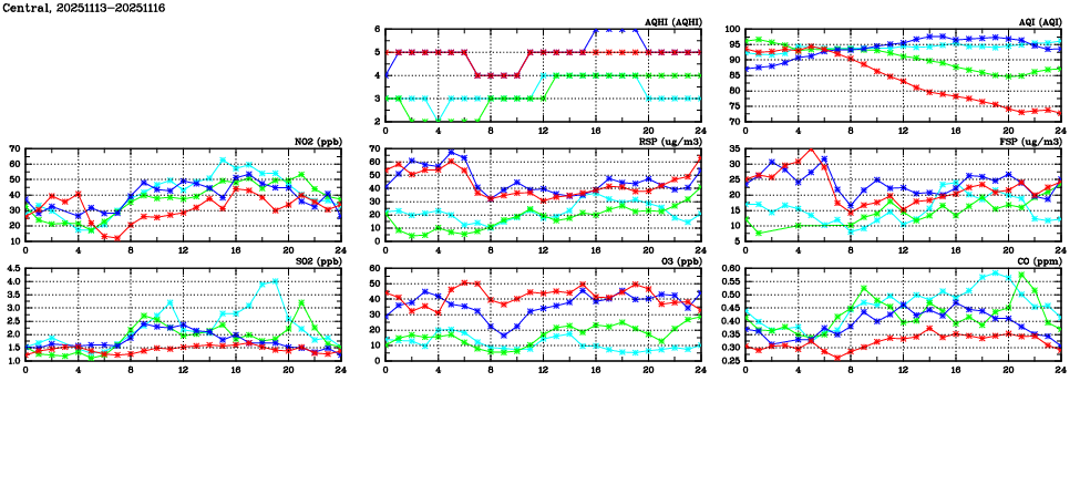 | Air Quality Data Time Series in Central (2025/11/16) | ( Line colors: Day -3 Day -2 Day -1 Current day ) | 2D Map Current AQHI |