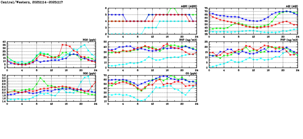 | Air Quality Data Time Series in Central/Western (2025/11/17) | ( Line colors: Day -3 Day -2 Day -1 Current day ) | 2D Map Current AQHI |