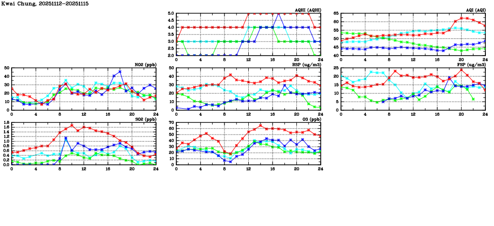 | Air Quality Data Time Series in Kwai Chung (2025/11/15) | ( Line colors: Day -3 Day -2 Day -1 Current day ) | 2D Map Current AQHI |