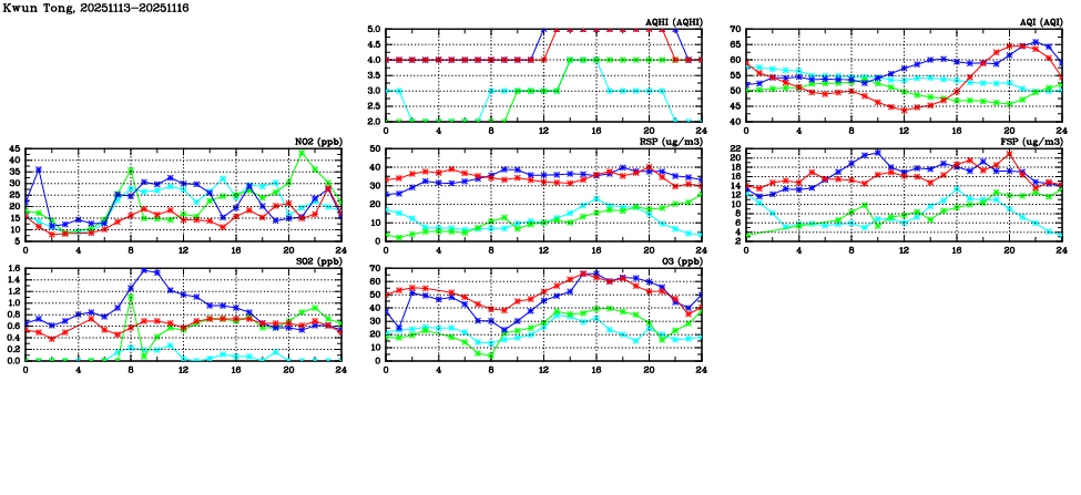 | Air Quality Data Time Series in Kwun Tong (2025/11/16) | ( Line colors: Day -3 Day -2 Day -1 Current day ) | 2D Map Current AQHI |