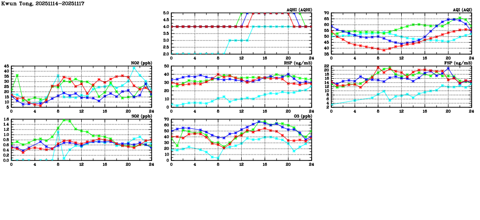 | Air Quality Data Time Series in Kwun Tong (2025/11/17) | ( Line colors: Day -3 Day -2 Day -1 Current day ) | 2D Map Current AQHI |