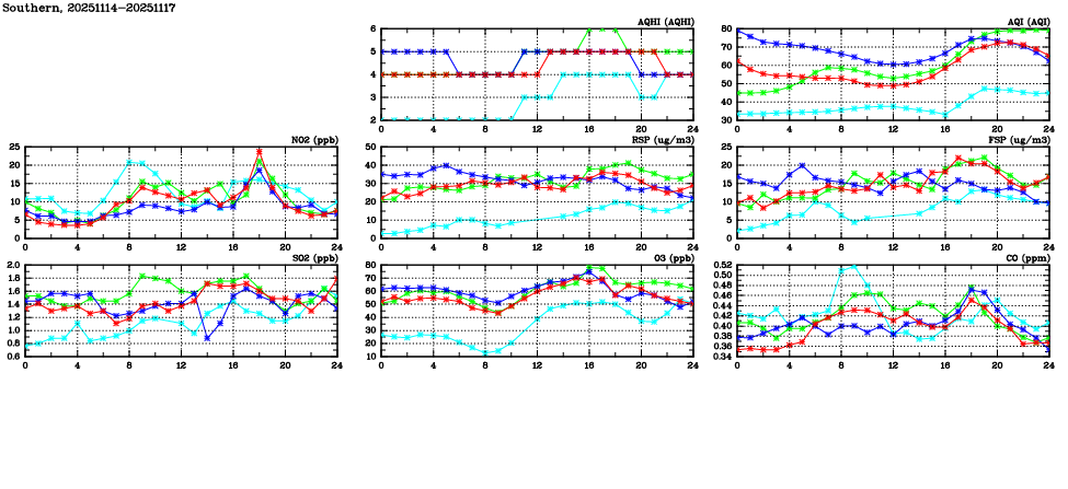 | Air Quality Data Time Series in Southern (2025/11/17) | ( Line colors: Day -3 Day -2 Day -1 Current day ) | 2D Map Current AQHI |