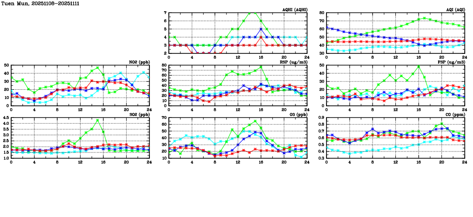 | Parameters: | AQHI | AQI | RSP | FSP | NO2 | SO2 | O3 | CO | Temp | WS | WD |