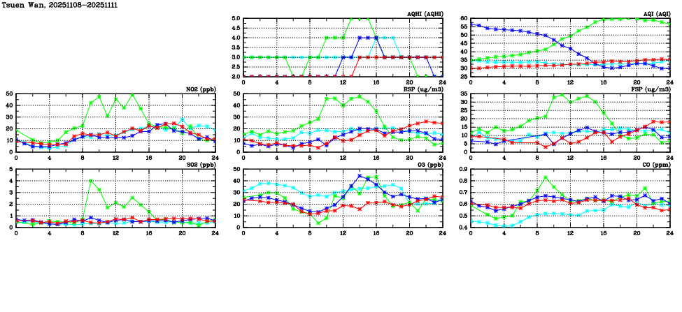 | Air Quality Data Time Series in Tsuen Wan (2025/11/11) | ( Line colors: Day -3 Day -2 Day -1 Current day ) | 2D Map Current AQHI |