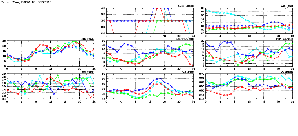 | Air Quality Data Time Series in Tsuen Wan (2025/11/13) | ( Line colors: Day -3 Day -2 Day -1 Current day ) | 2D Map Current AQHI |