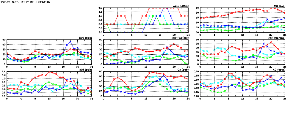 | Air Quality Data Time Series in Tsuen Wan (2025/11/15) | ( Line colors: Day -3 Day -2 Day -1 Current day ) | 2D Map Current AQHI |