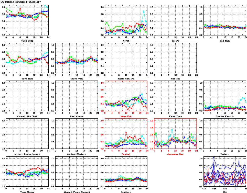 | Air Quality Data Time Series for CO (2025/11/17) | ( Line colors: Day -3 Day -2 Day -1 Current day ) | 2D Map Current AQHI |