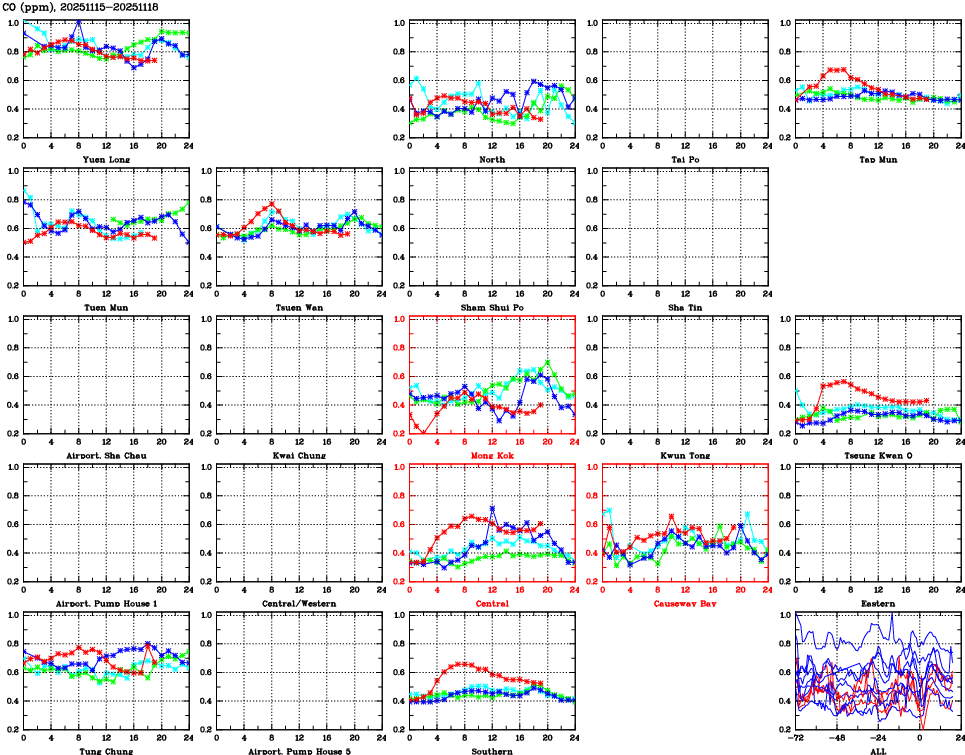 | Air Quality Data Time Series for CO (2025/11/18) | ( Line colors: Day -3 Day -2 Day -1 Current day ) | 2D Map Current AQHI |