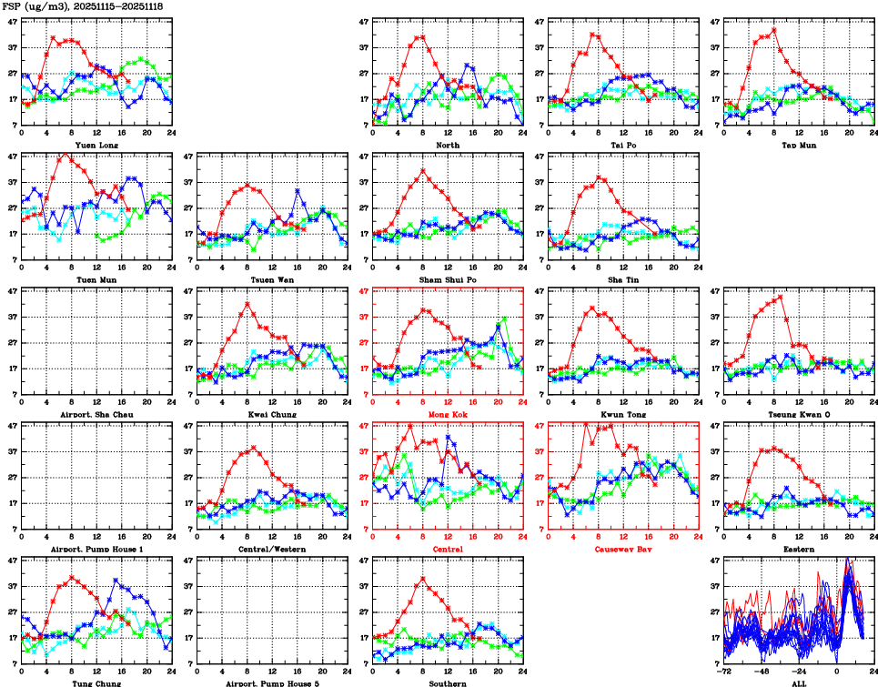| Air Quality Data Time Series for FSP (2025/11/18) | ( Line colors: Day -3 Day -2 Day -1 Current day ) | 2D Map Current AQHI |