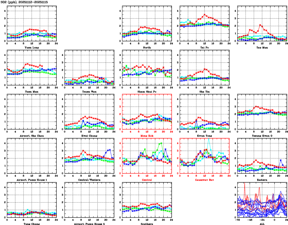 | Air Quality Data Time Series for SO2 (2025/11/15) | ( Line colors: Day -3 Day -2 Day -1 Current day ) | 2D Map Current AQHI |