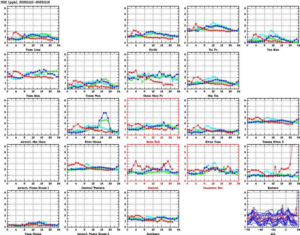| Air Quality Data Time Series for SO2 (2025/11/18) | ( Line colors: Day -3 Day -2 Day -1 Current day ) | 2D Map Current AQHI |